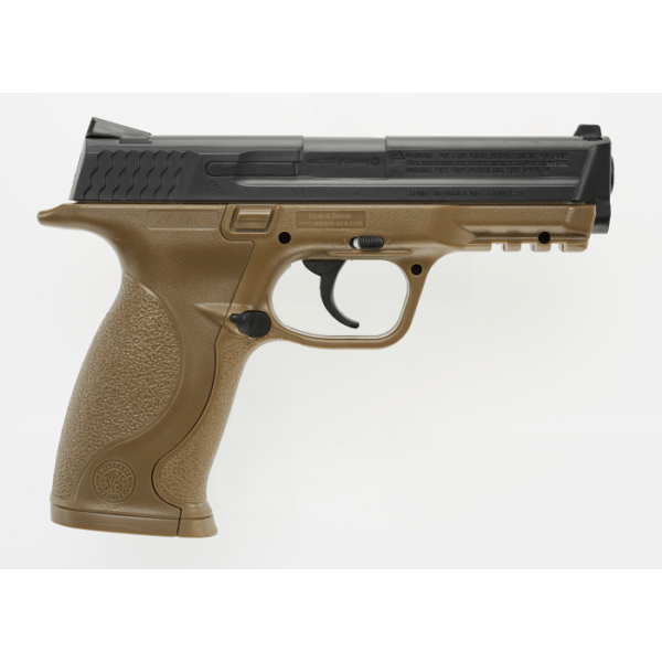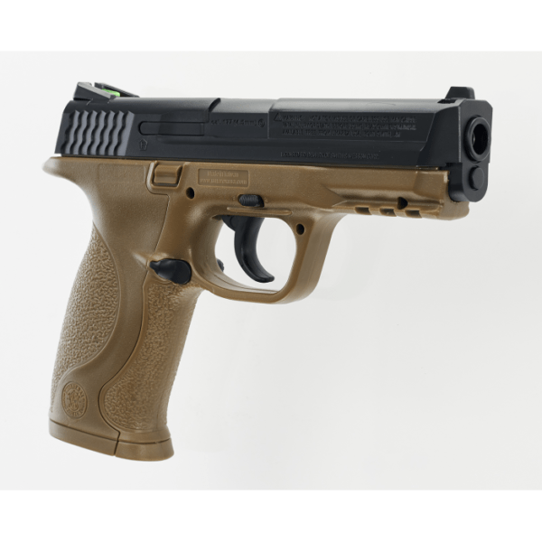 La pistola de CO2 Smith and Wesson M&P tiene un gatillo de doble acción de seguridad manual que está sorprendentemente cerca de la pistola real y miras de fibra óptica delanteras y traseras fijas.